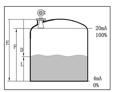 通過輸入空罐高度E(=零點),滿罐高度F(=滿量程)及一些應用參數來設定,應用參數將自動使儀表適應測量環(huán)境。對應于4-20mA輸出。