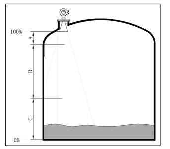 2介質為低介電常數當其處于低液位時,罐低可見,此時為保證測量精度,建議將零點定在低高度為C 的位置。